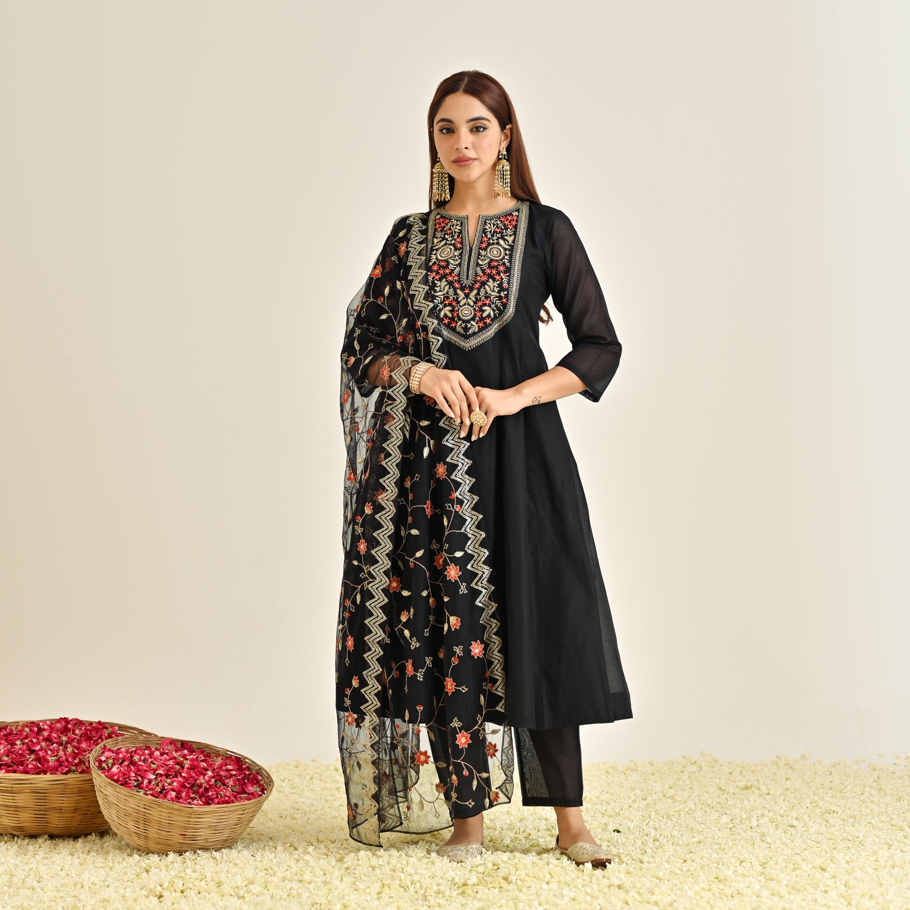 Black Festive Anarkali Set with Embroidered Dupatta & Yoke Detail