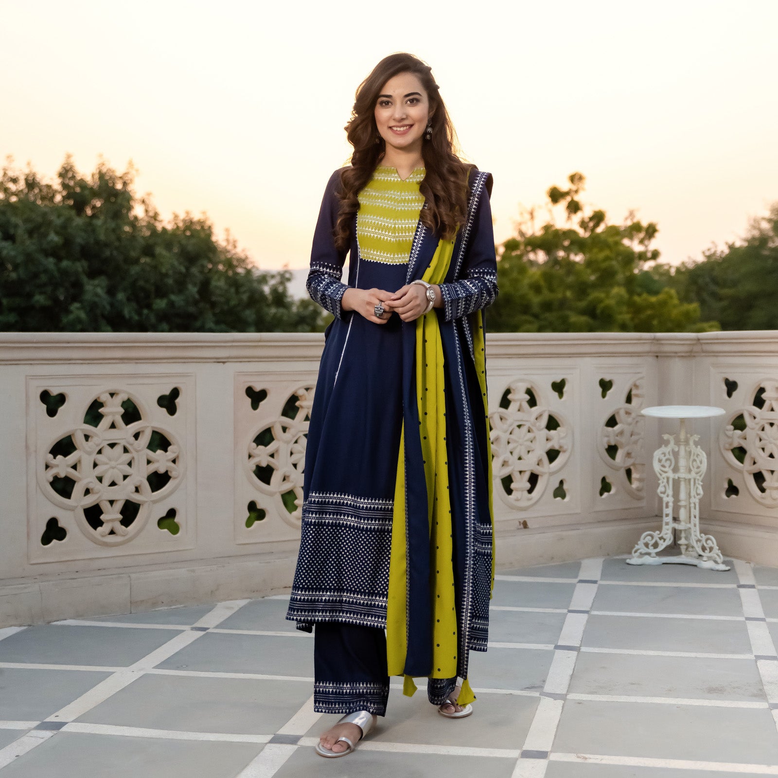 Blue & Olive Silver Printed Flared Kurta Dupatta Set with Gota Details
