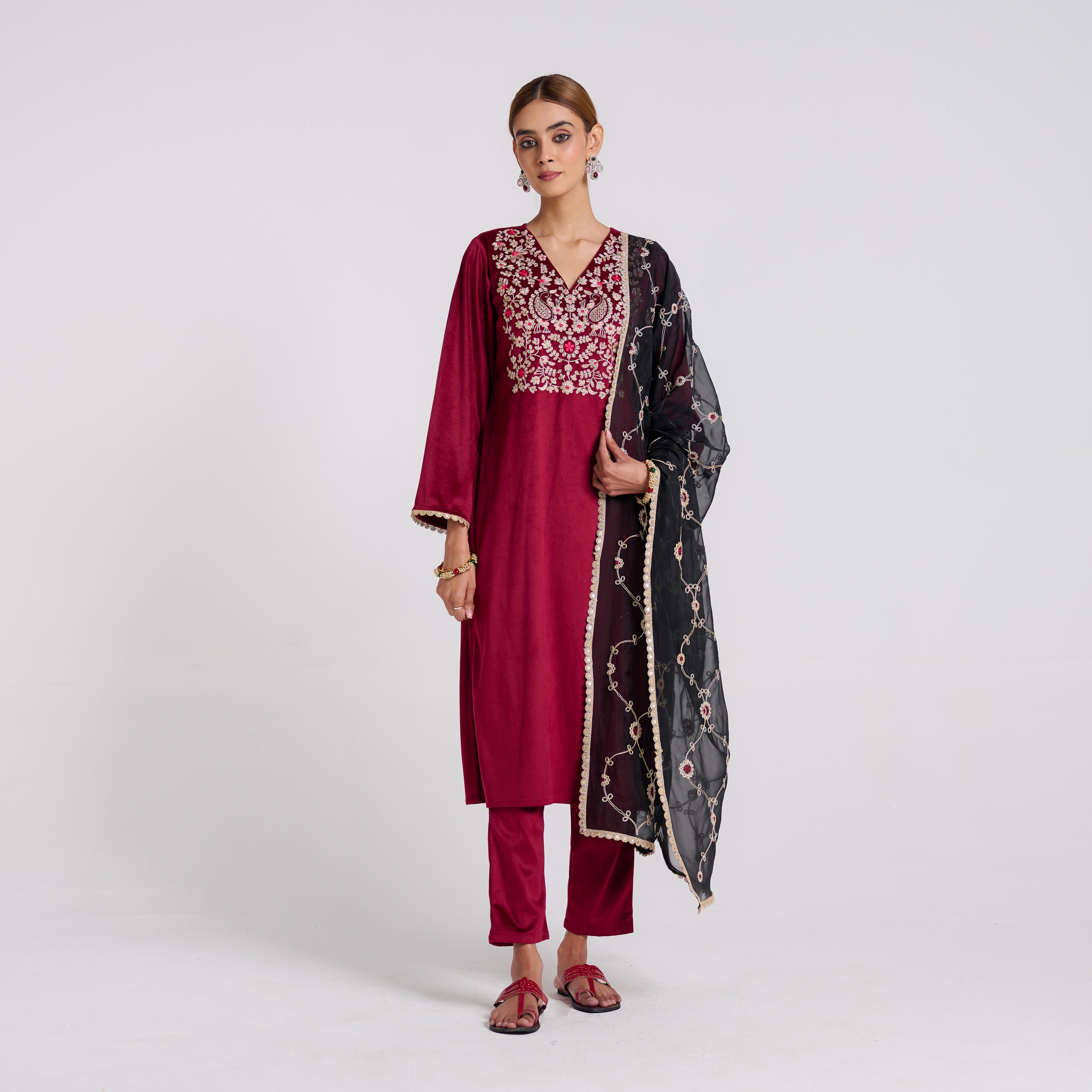 Be the first to review “Maroon Embroidered Gulzaar Velvet Set with Dupatta” Cancel reply