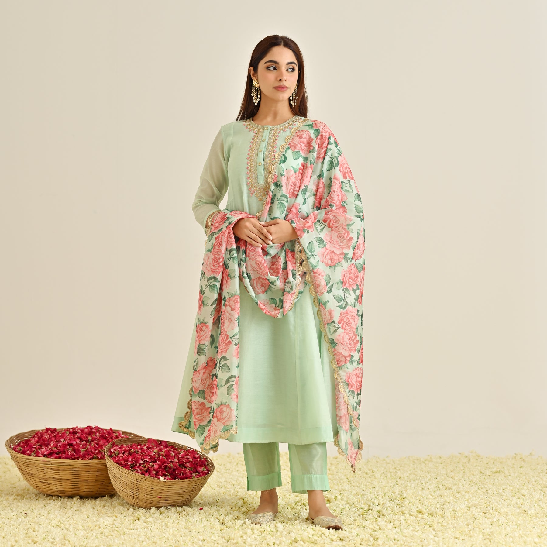 Mint Blue Anarkali Set with Floral Printed Dupatta & Yoke Embroidery