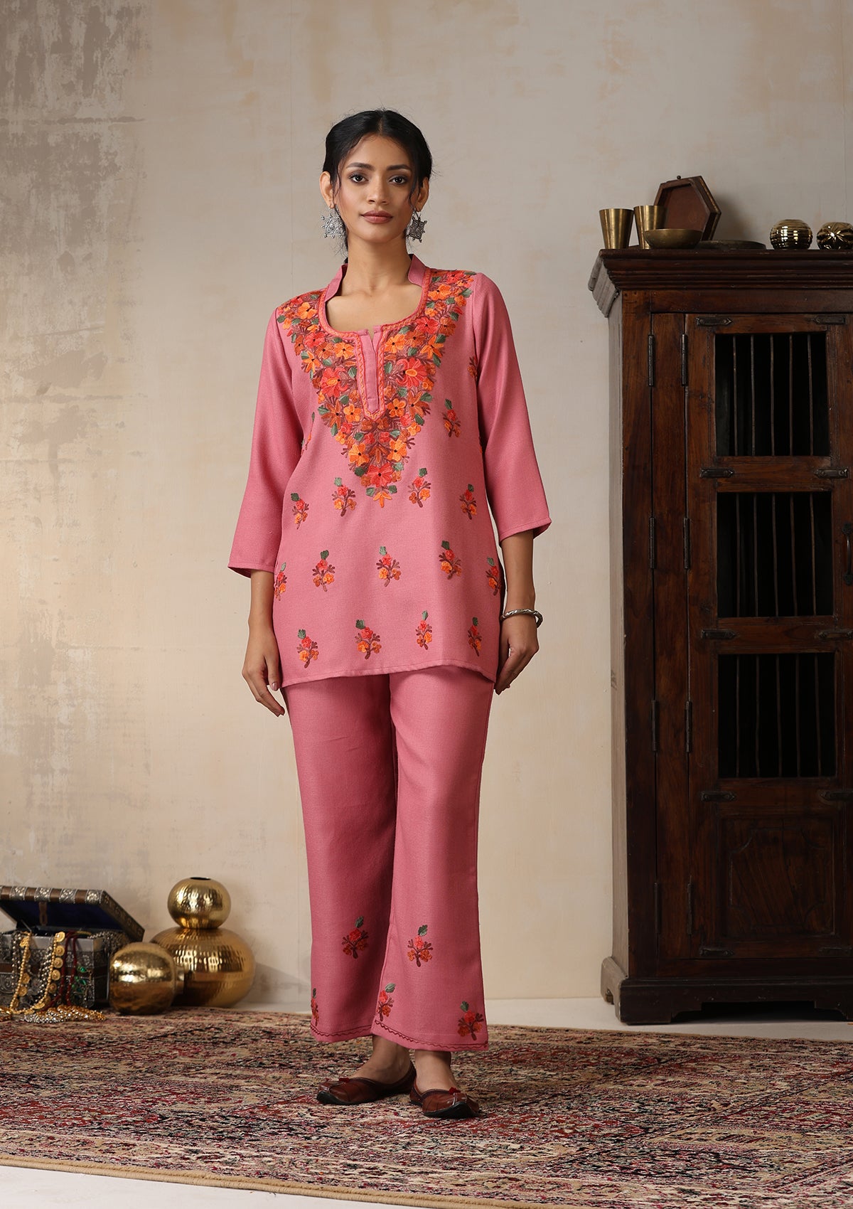 Pantalms Crafts Woollen Aari Embroidered Solid Women’s 2 PC Short Kurta Set – Pink
