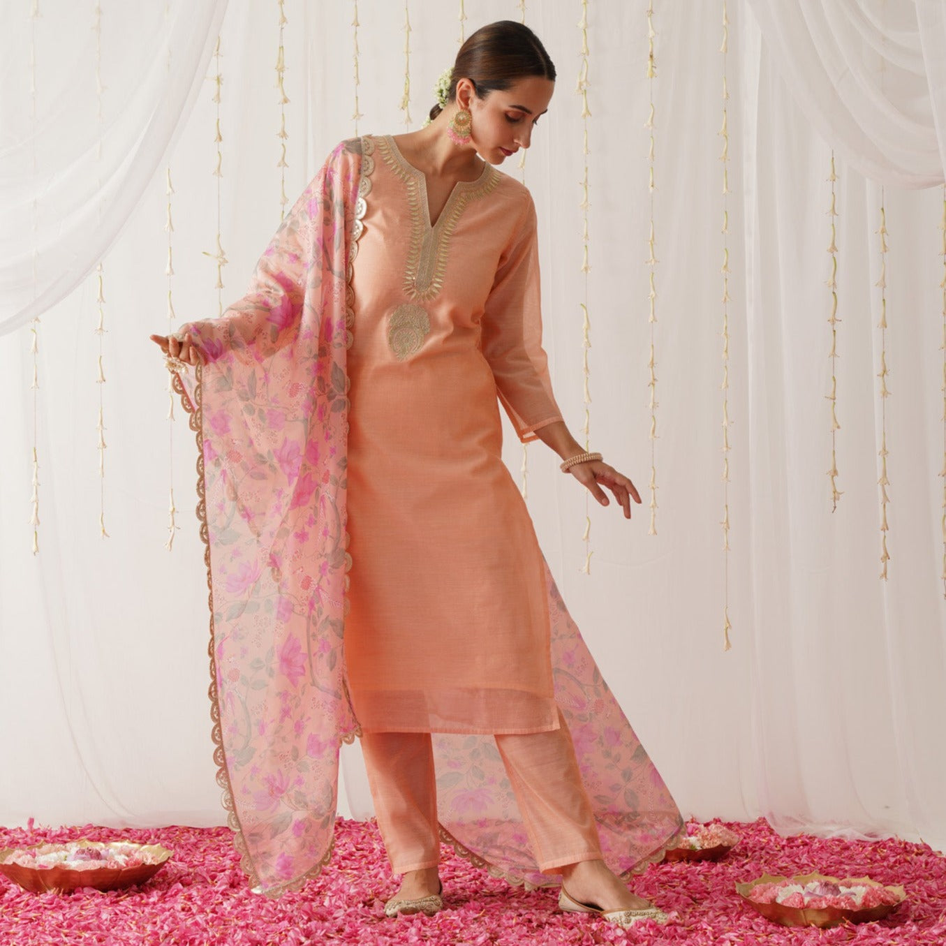 Peach Embroidered Chanderi Kurta Pant Dupatta Set with Gota Details