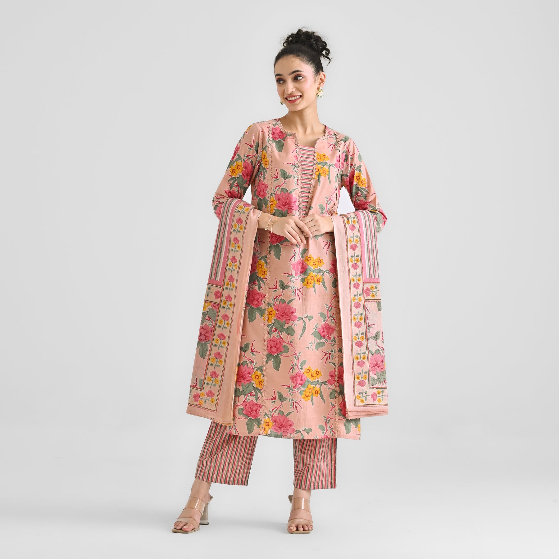 Be the first to review “Peach Sanganeri Floral Printed Cotton Kurta Pant Set with Dupatta & Lace Detail” Cancel reply