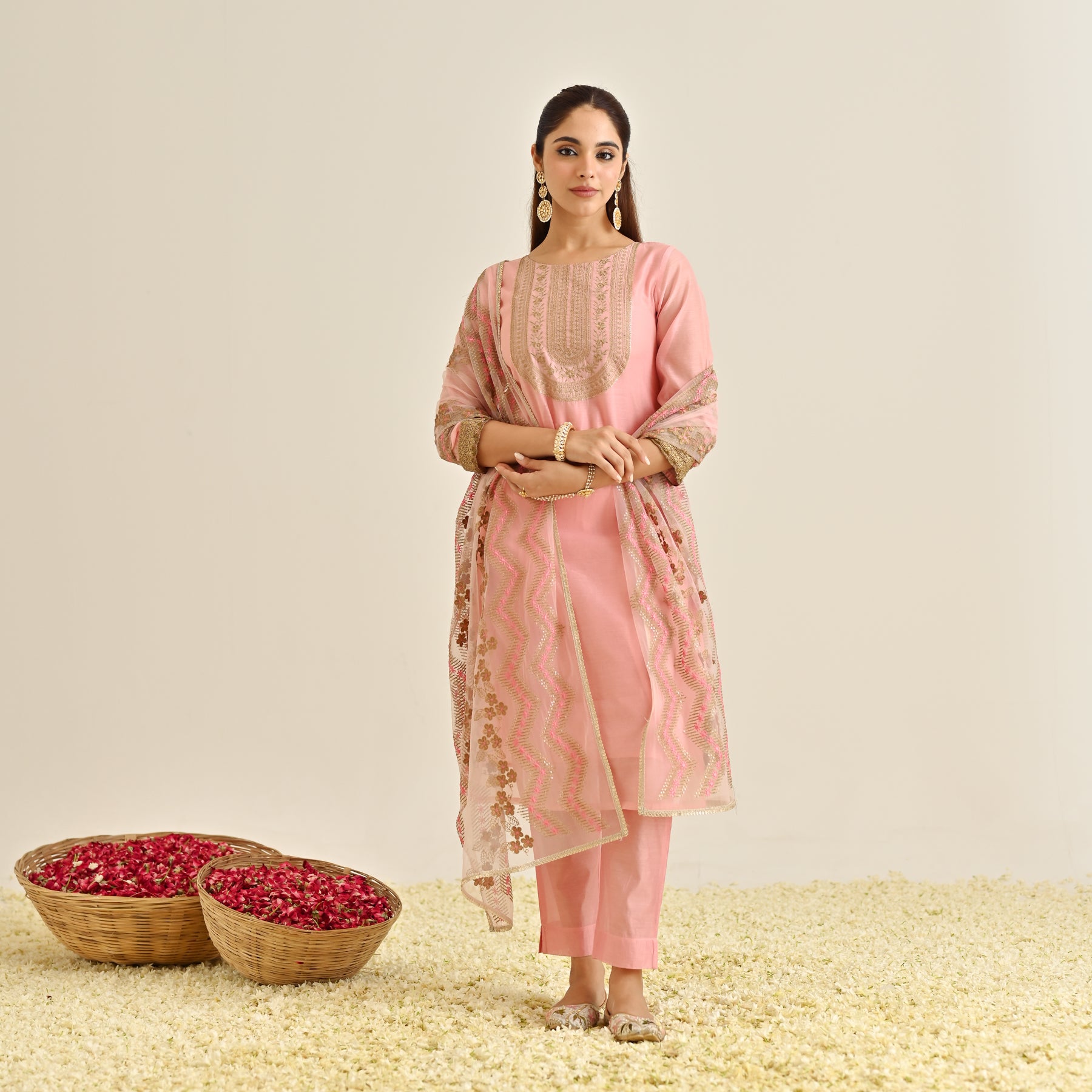 Pink Festive Embroidered Kurta Set with Embroidered Dupatta & Yoke Detail