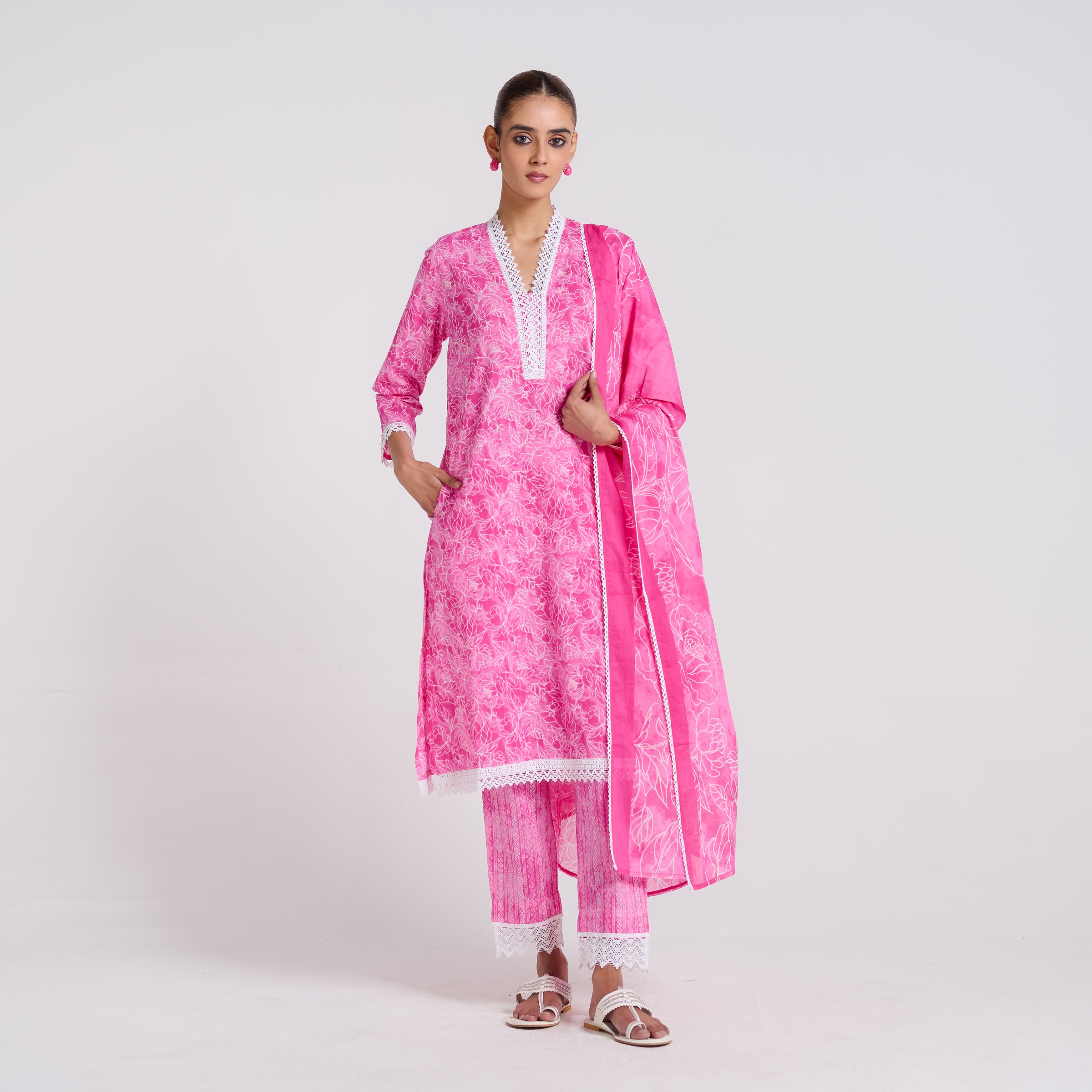 Pink Pure Cotton Kurta Set with Dupatta and Lace Detail