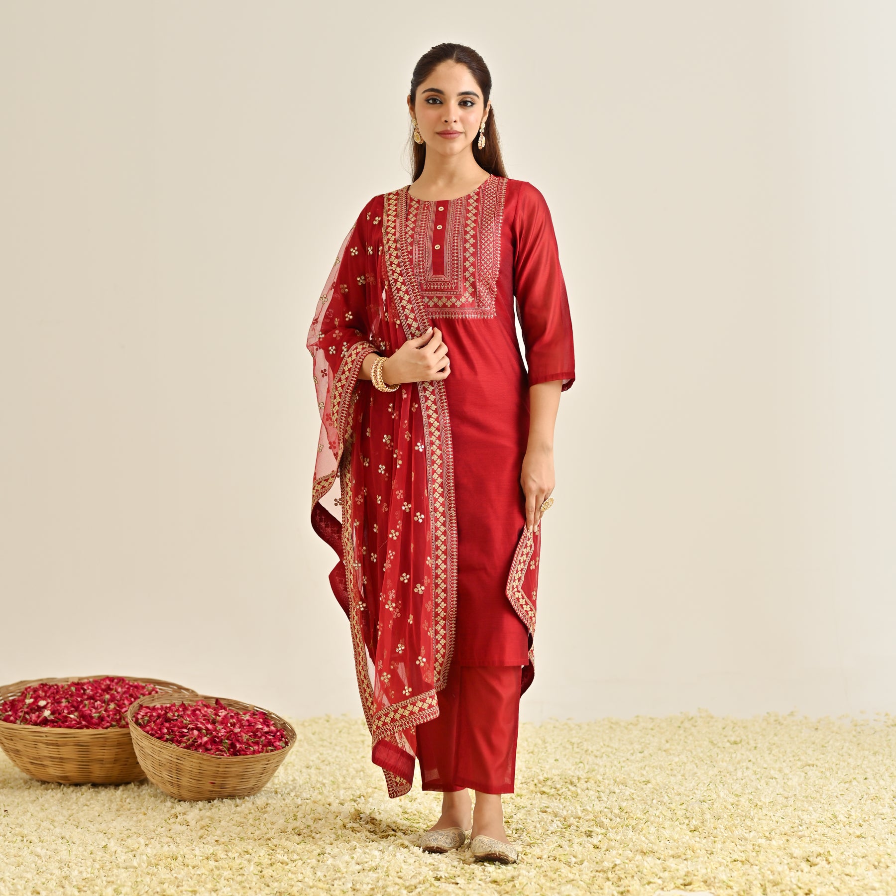 Red Festive Embroidered Kurta Set with Embroidered Dupatta