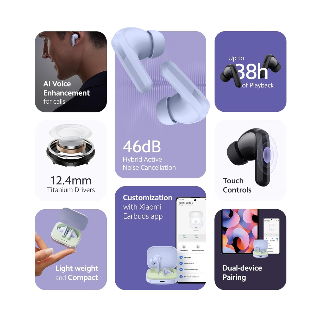Redmi Buds 5 Truly Wireless Bluetooth in Ear Ear Buds (TWS) with Upto 46Db Hybrid Noise Cancellation,Dual-Mic Ai Call Enhancement,10Mins for 4Hours Fast Charging with Upto 38Hrs Playback|Fusion