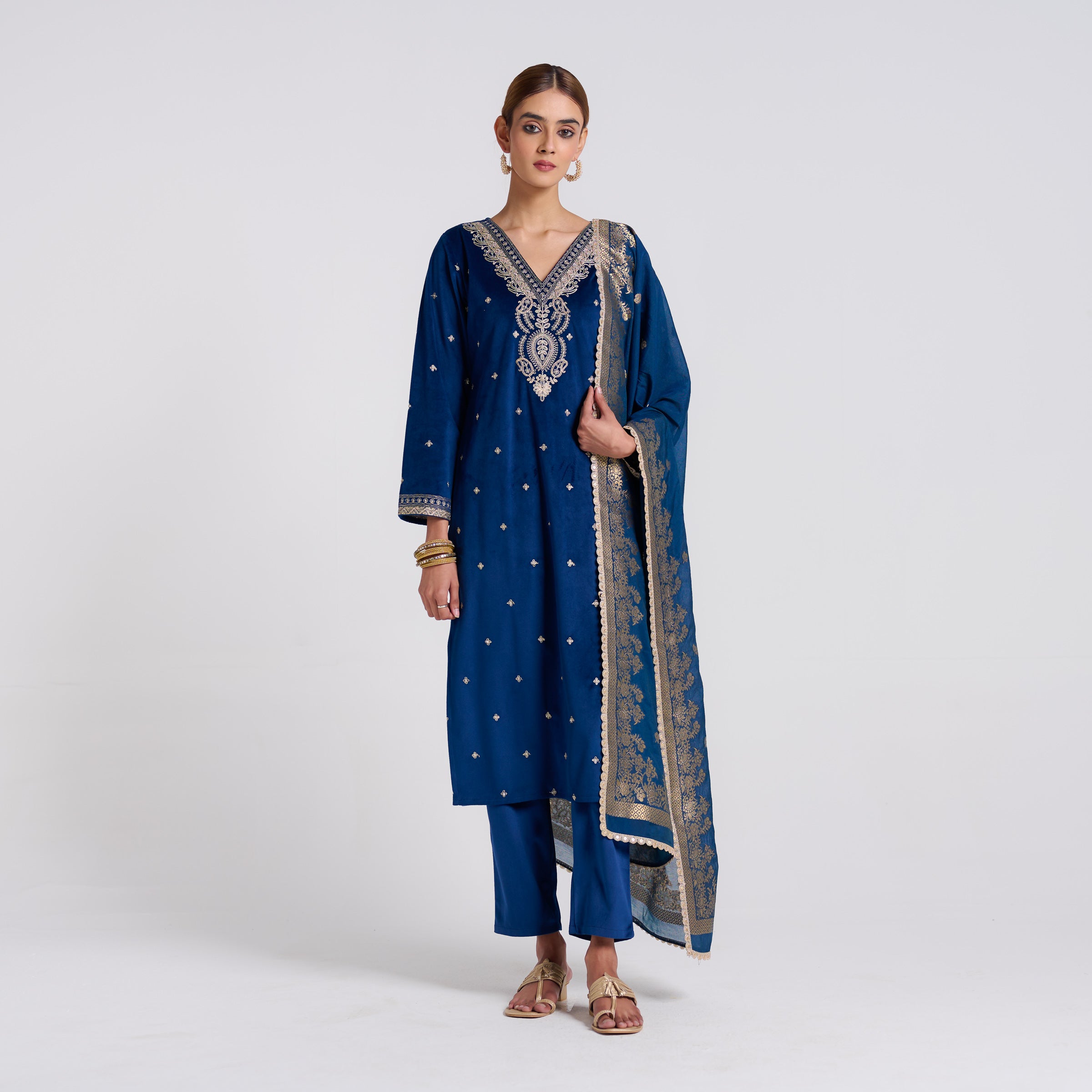 Royal Blue Varak Embroidered Velvet Set with Brocade Dupatta