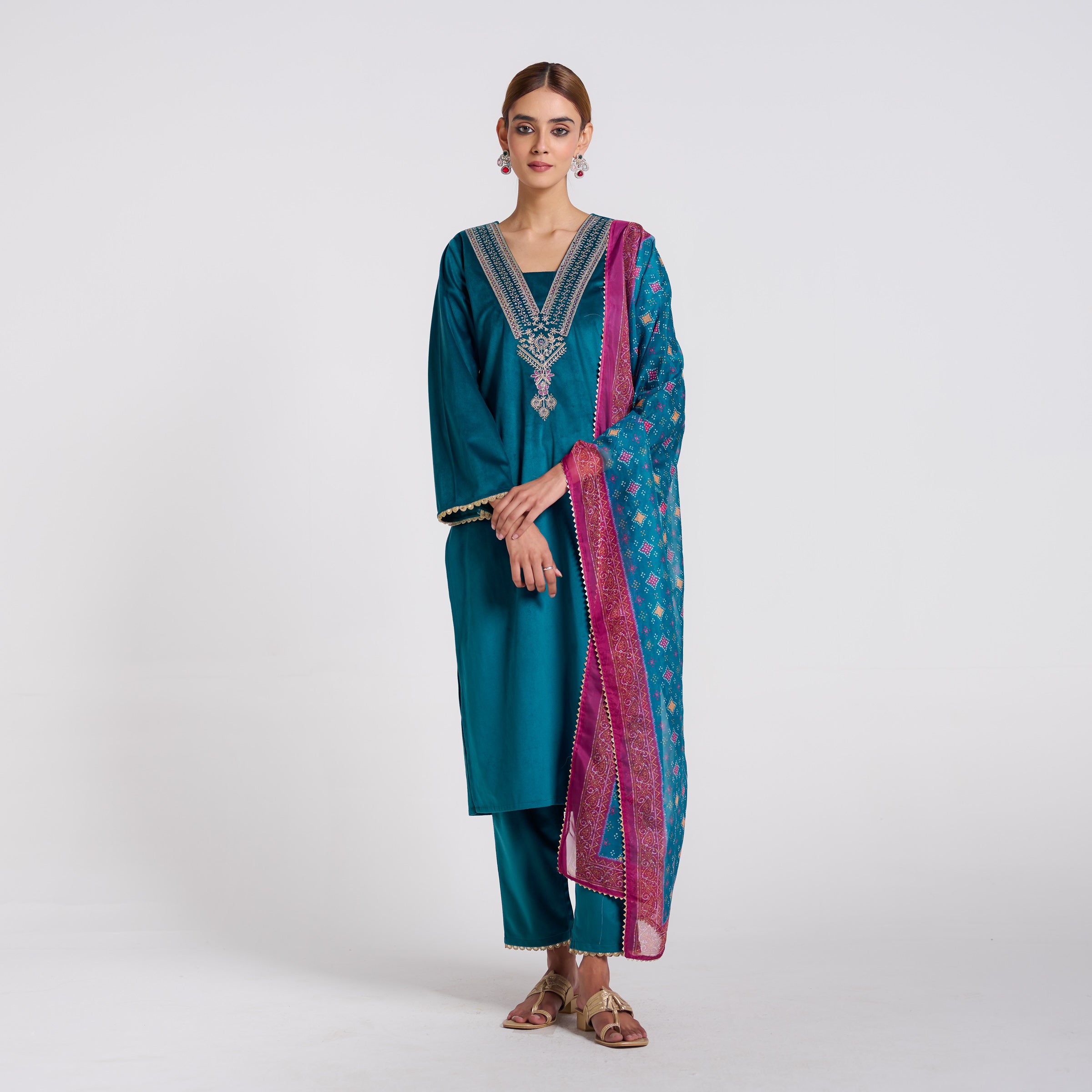 Teal Embroidered Zareen Velvet Set with Dupatta