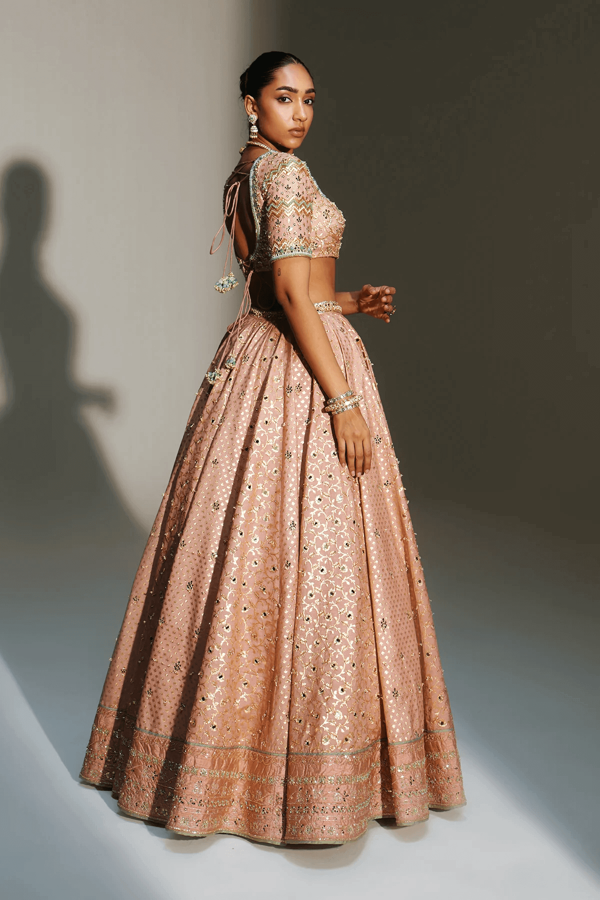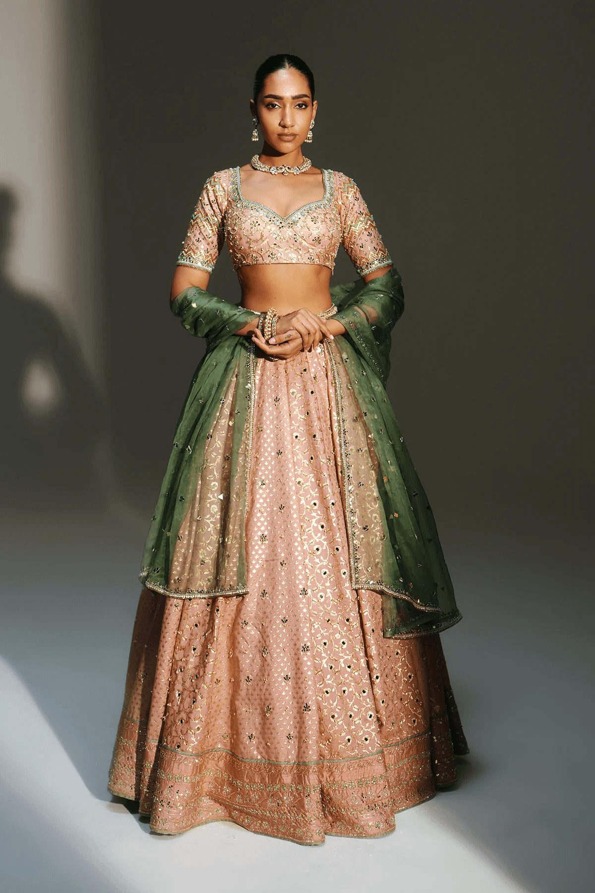 Hand-Embroidered Blush Pink Lehenga Set with intricate dragonfly motifs on the skirt, paired with a coordinated blouse and a contrasting dupatta. Crafted with fine zari and threadwork, the ensemble features a structured blouse and a gracefully draped dupatta—perfect for weddings and festive occasions.