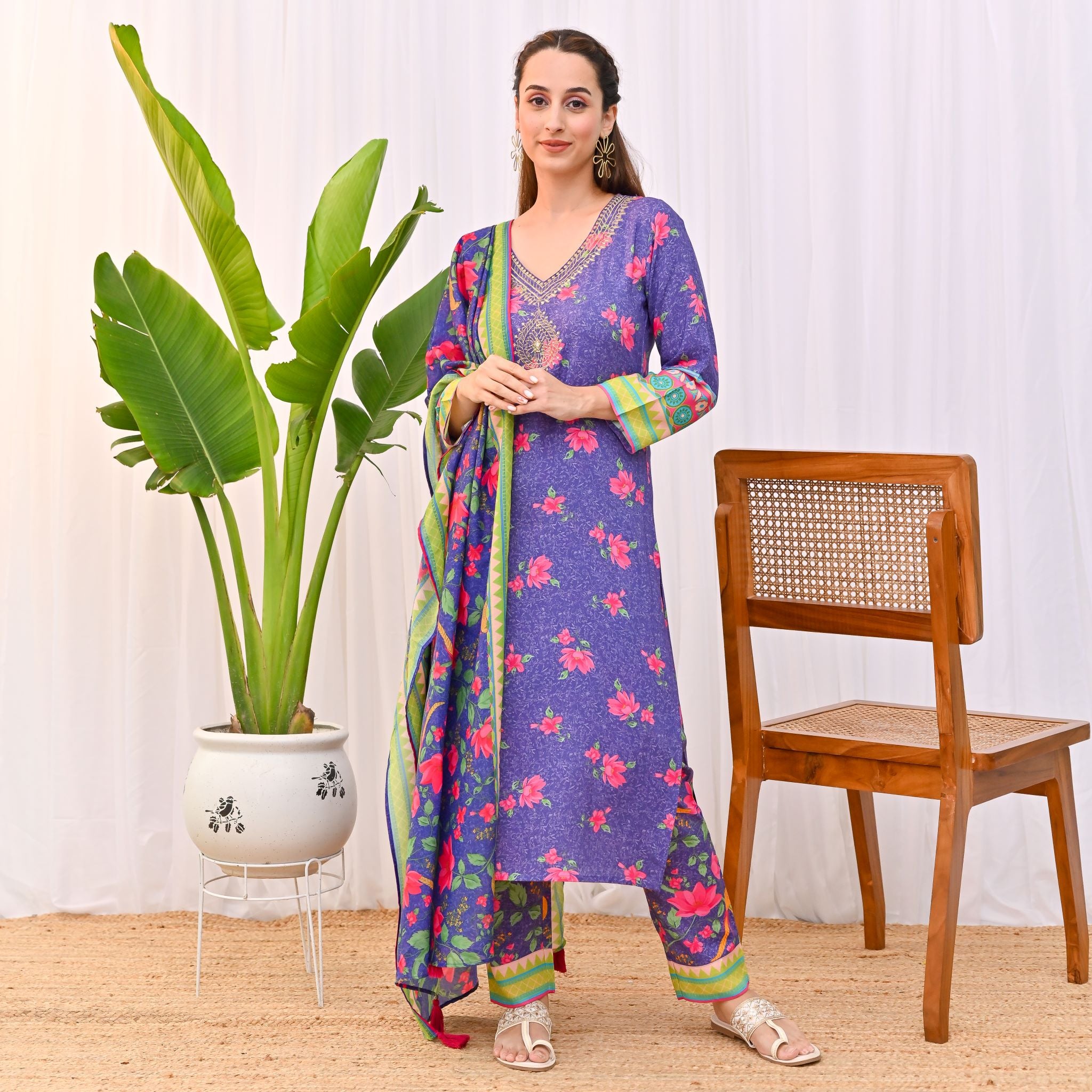 Violet Lotus Printed Salwar Kurta Set with Dupatta & Neck Embroidery Detail