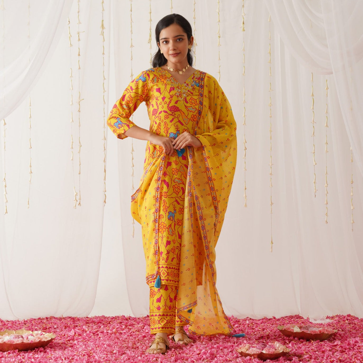 Yellow Neck Embroidered Kurta Set with Dupatta